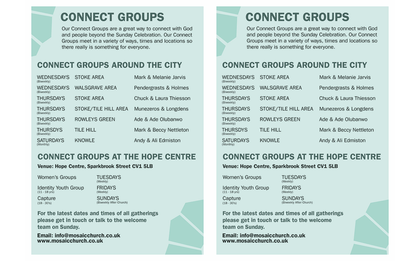 This project was completed as part of my freelance design business. The church asked me to refresh the brand of the church but to keep the existing logo. I have created a series of works that have included web pages, printed brochures, podcasts, leaflets and videos.